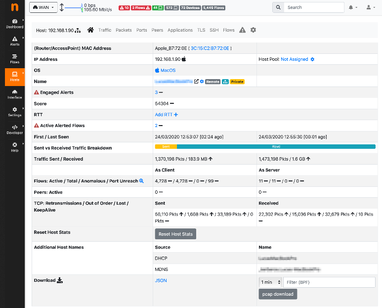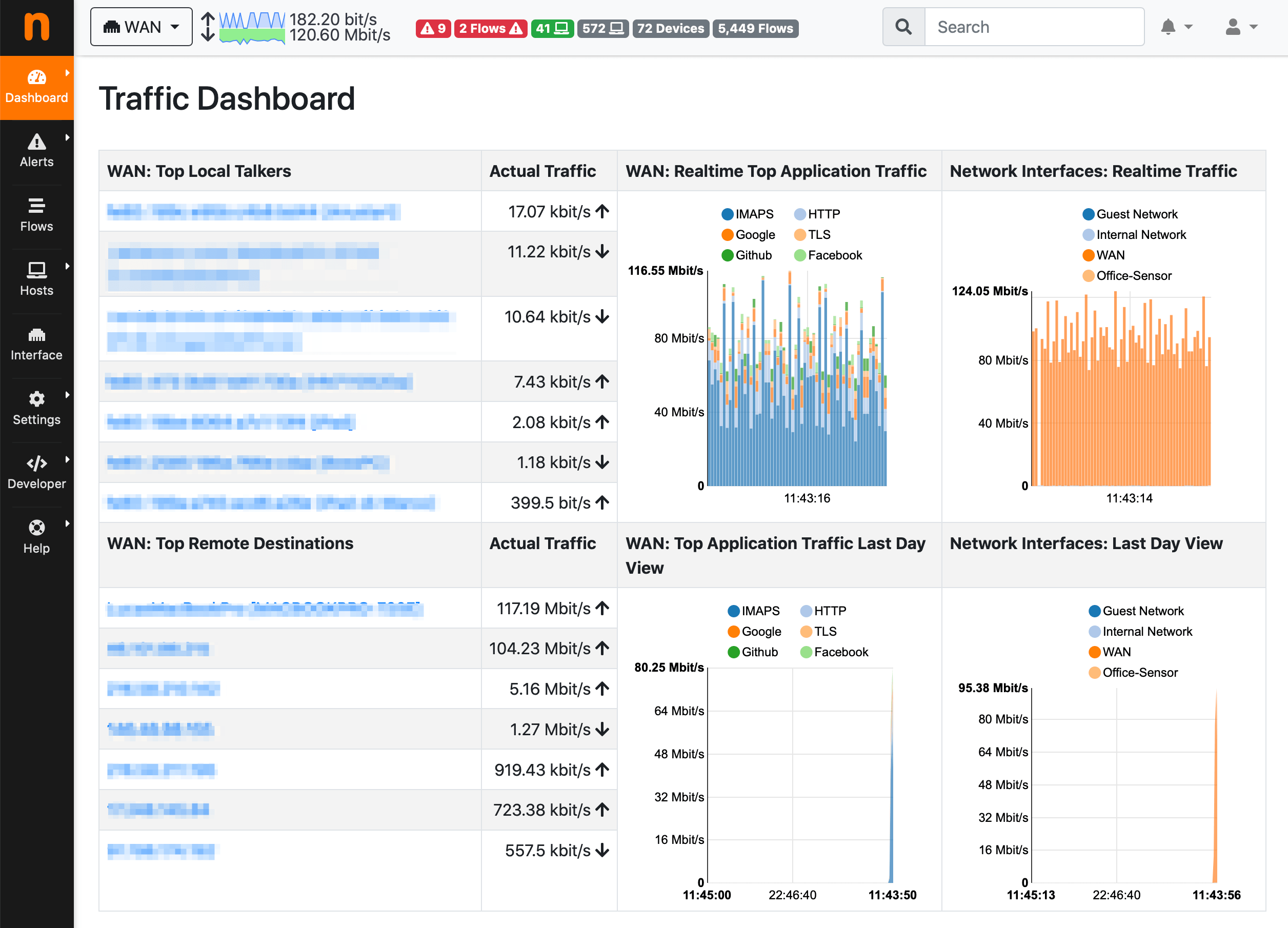 a High-Speed Web-based Traffic Analysis and Flow Collection package on pfsense/opnsense. Also a network traffic probe that monitors concurrent network usage. ntopNG is based on libpcap/PF_RING and it has been written in a portable way in order to virtually run on pfsense / opnsense. ntopNG provides a intuitive, encrypted web user interface for the exploration of real time and historical traffic information.